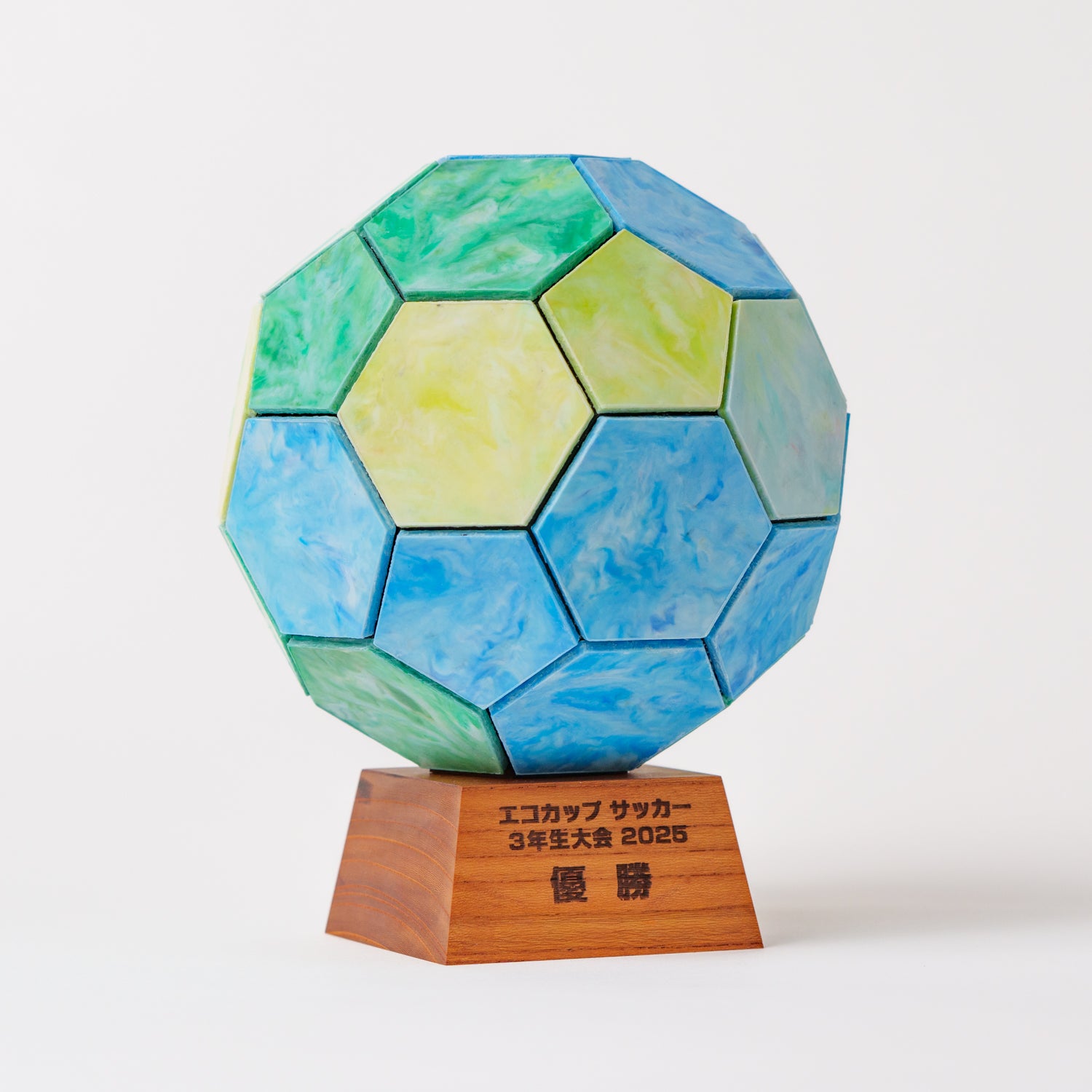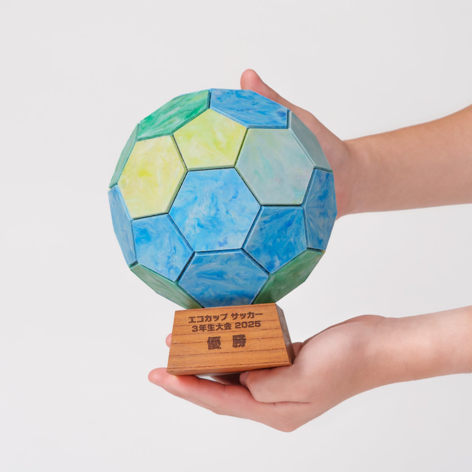 今回完成したサッカーボール型のトロフィーと、サッカーボールをモチーフにした表彰盾は、品川区商店街連合会様とのコラボレーションから生まれたプロダクトです。品川区で開催された少年サッカーリーグ戦の表彰式で子どもたちに渡す記念品として、「子どもたちが自ら集めたペットボトルキャップで作れないか」というご相談をいただき、弊社がデザイン、設計、製作方法の考案まで一貫して担当し、形にしました。