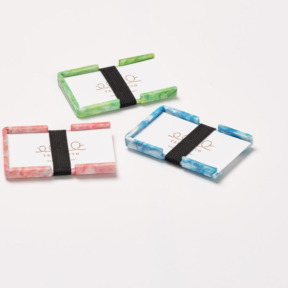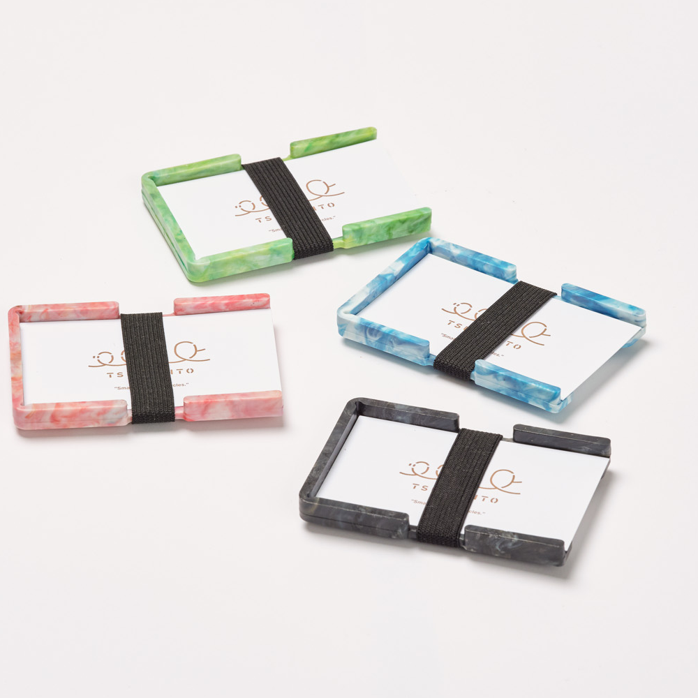 環境への配慮とストーリー性を踏まえ、持つ人の価値観をさりげなく伝えるアイテム。名刺やショップカードを約10枚収納でき、展示会や名刺交換の場での話題づくりにも。