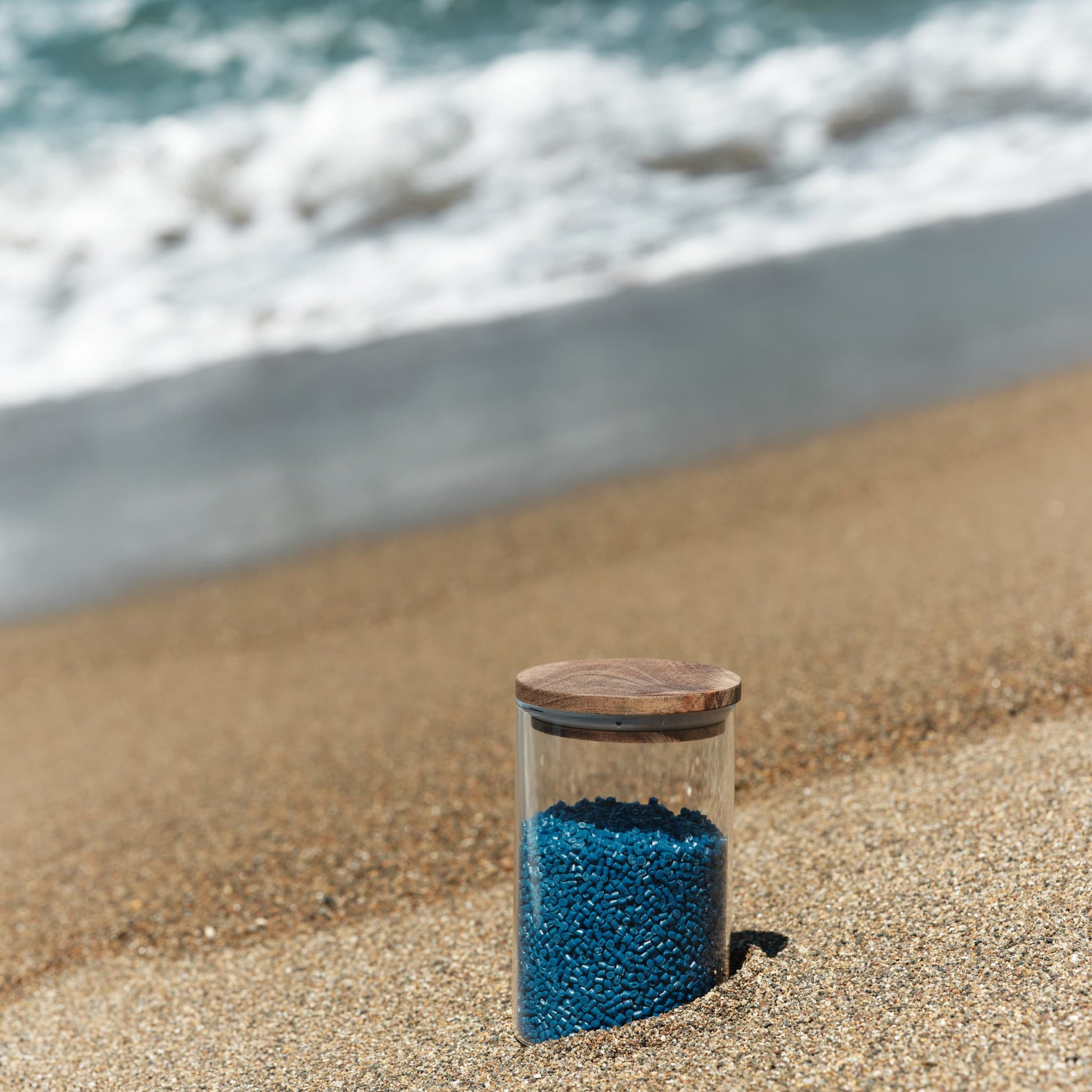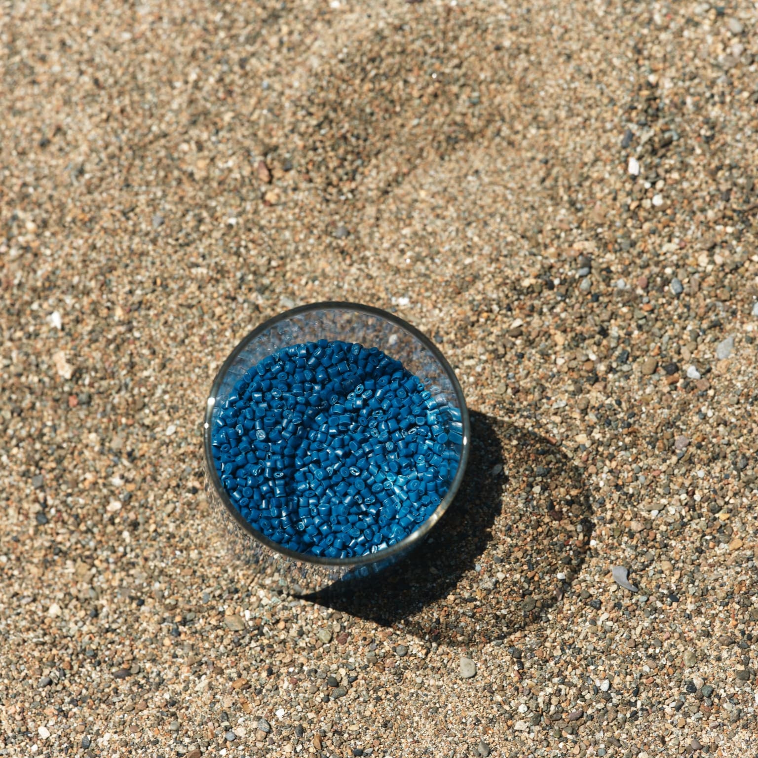 福井県の越前海岸や若狭小浜の海岸に漂着した海洋プラスチックを回収・洗浄・選別し、粉砕・ペレット化した100%海洋プラスチック素材です。(材質は、PPおよびPEの混合)