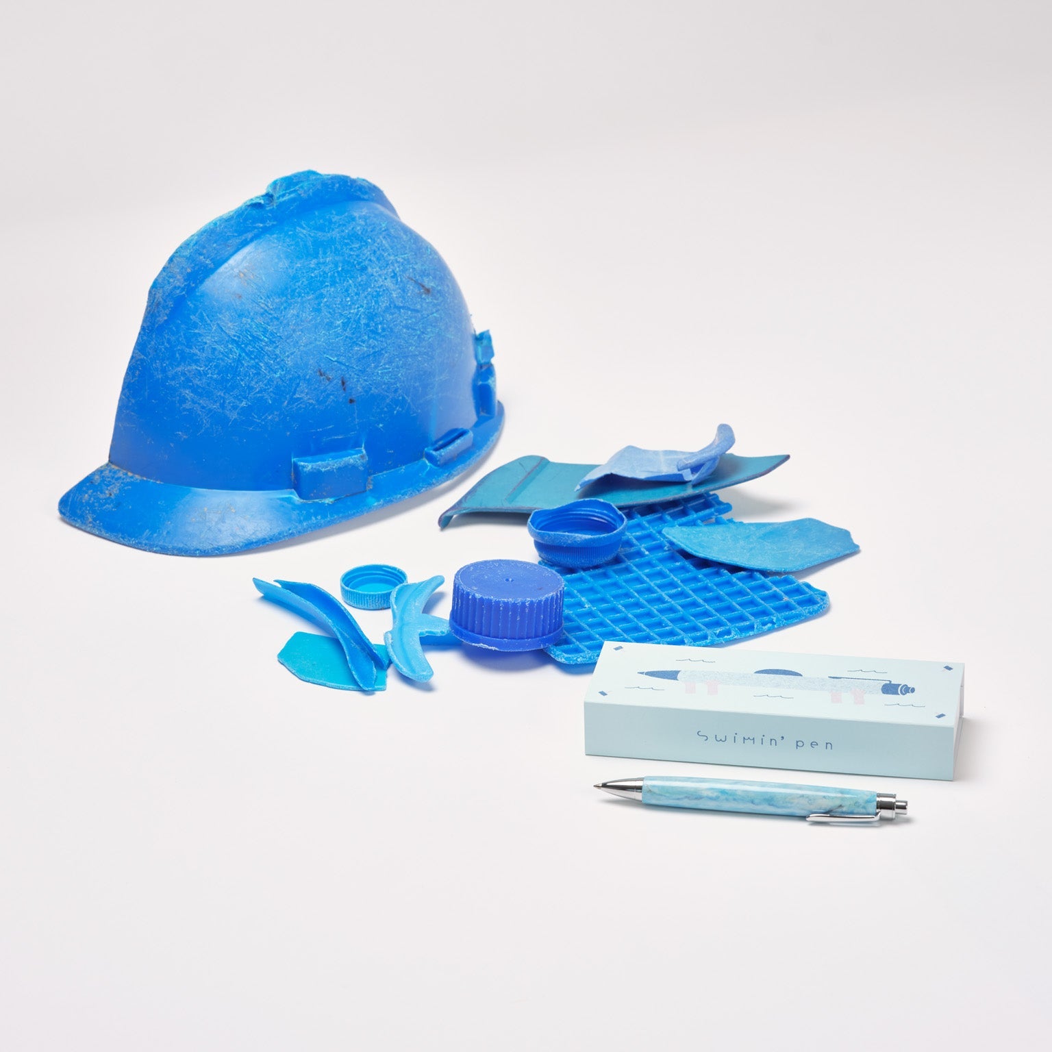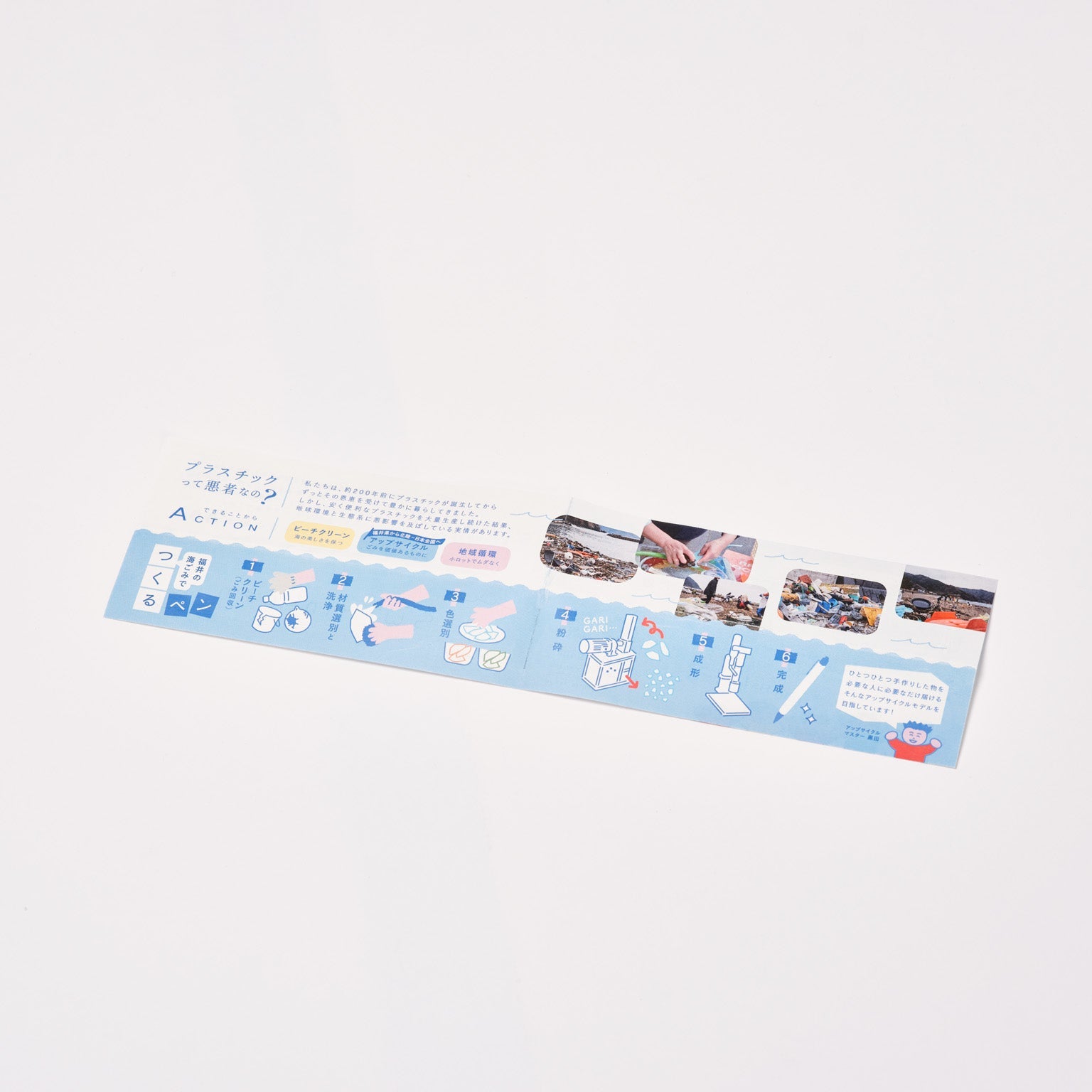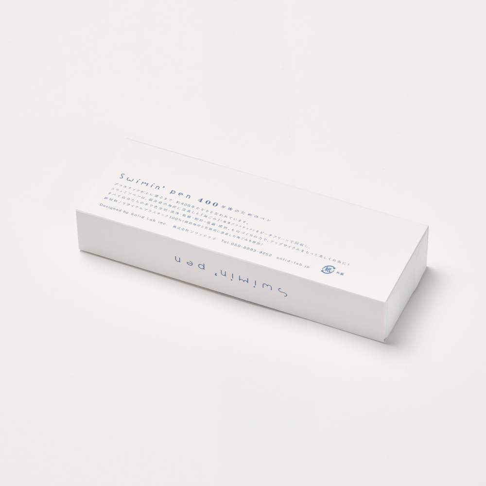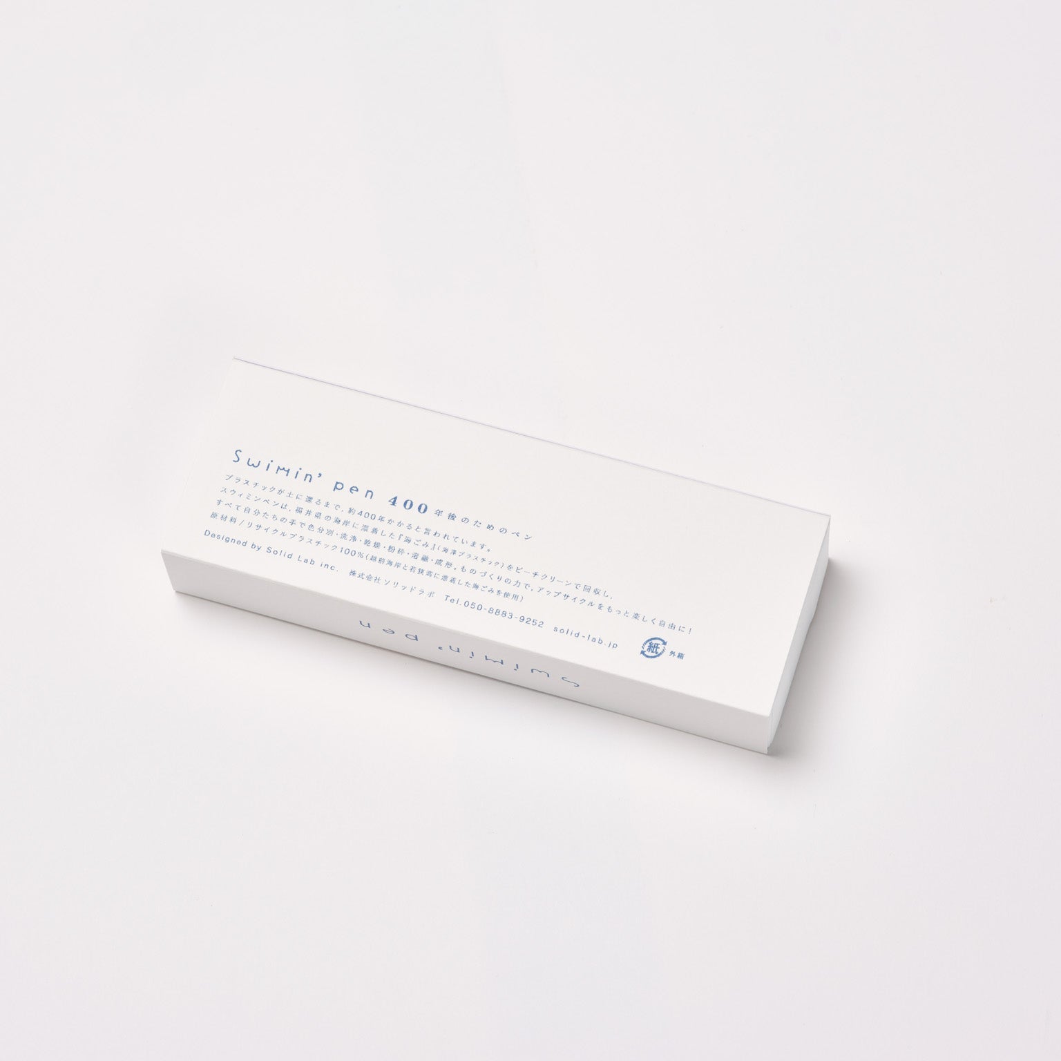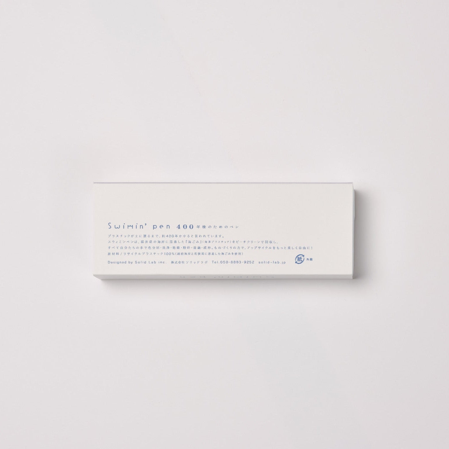 福井県のグラフィックデザイナー:髙嶋ゆい氏による、パッケージデザインとネーミング監修のコラボ製品。福井の海に漂着した海洋プラスチックを1つ1つすべて手作業で洗浄し作り上げた1点モノの工芸品です。パッケージ印刷には、環境に優しいライスインクのリソグラフを採用。福井県大野市の印刷・編集室みなと印刷のもと、プロダクトからパッケージまでエシカルな製品を実現しました。ストーリー性のある筆記具で、毎日使う文具に環境への想いを込められます。 毎日使うペンを『swimin’ pen』に置き換えることで、海のクリーンアップ活動を応援することができます。アップサイクルの過程やストーリーを描いたイラスト付き説明書もセットでお届けします。